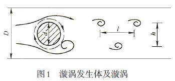 渦街流量計屬于速度式流量計,是由漩渦發(fā)生體和頻率檢測器構(gòu)成的變送器、信號轉(zhuǎn)換器等環(huán)節(jié)組成。其測量原理是在流動的流體中,若垂直流動方向放置一個漩渦發(fā)生體,在某一雷諾數(shù)范圍內(nèi),將在漩渦發(fā)生體的后面的兩側(cè)交替產(chǎn)生有規(guī)律的漩渦(見圖1),旋渦列在旋渦發(fā)生體下游非對稱地排列。