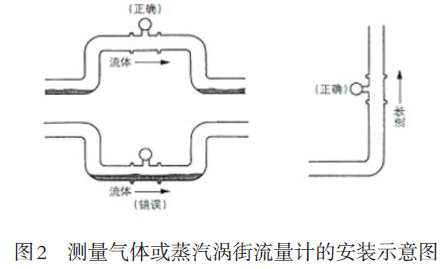 測量氣體或蒸汽時,渦街流量計安裝在水平管道上,配管時應(yīng)注意防止液體滯留,渦街流量計應(yīng)安裝在管線的較高處或?qū)⒀b有渦街流量計的管段抬高。渦街流量計安裝在垂直管道上,流向不限,若被測氣體中含有少量的液體,氣體流量應(yīng)由下向上,如圖2所示。