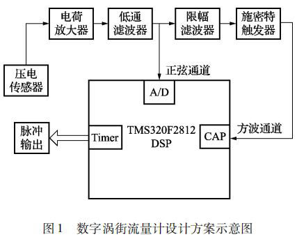 本文設計的基于 TMS320F2812 DSP 的數(shù)字飽和蒸汽計量表的信號處理系統(tǒng)由前置放大電路和數(shù)字信號處理電路兩部分組成。本文選用的前置放大電路即為目前被廣泛應用的普通飽和蒸汽計量表的前置放大電路,主要由電荷放大電路、低通濾波電路、限幅濾波電路和施密特觸發(fā)電路組成; 對于經(jīng)壓電傳感器測得的渦街信號采用了頻域分析和時域分析相結(jié)合的方式,即由前置放大電路和數(shù)字信號處理電路相配合。時域分析通道利用 DSP 事件管理器的捕獲模塊,對前置放大電路輸出的方波進行頻率計算,然后再由 DSP 事件管理器通用定時器的比較輸出模塊進行脈沖輸出。頻域分析通道即 DSP對低通濾波電路輸出的疊加了許多噪聲的正弦信號進行 A/D 采樣,再利用 DSP 對 A/D 采樣的結(jié)果進行頻譜分析,從而得出此時渦街信號的頻率,*后由 DSP 通用定時器的比較輸出模塊進行脈沖輸出。系統(tǒng)設計方案示意圖如圖 1 所示。
