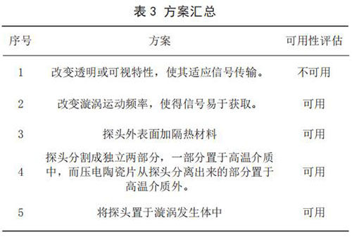 3)查找沖突矩陣,得到如下發(fā)明原理:No.32 改變顏色、No.19 周期性作用、No.24 中介物。方案一:依據(jù)No.32 改變顏色發(fā)明原理,得到解如下:改變透明或可視特性,使其適應信號傳輸。方案二:依據(jù) No.19 周期性作用,得到解如下:改變漩渦運動頻率,使得信號易于獲取。方案三:依據(jù) No.24中介物,得到解如下:探頭外表面加真空絕熱材料。