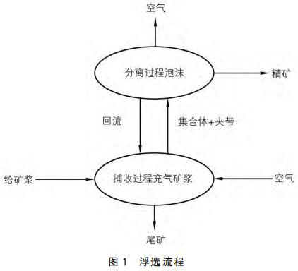 浮選是依據(jù)礦物原料表面的化學(xué)性質(zhì),向待浮選的礦漿中加入浮選藥劑和空氣,使其與礦漿充分融合,并根據(jù)各礦物原料的黏附程度的不同,分選出不同的礦物。浮選過程一般分為礦漿碰撞、黏附、上浮以及精煤溢出四個階段。礦物原料在浮選藥劑的作用下,與 空氣發(fā)生器產(chǎn)生的小氣泡發(fā)生充分碰撞,進(jìn)行礦物捕集。利用礦物間的疏水特性,礦物粘附于氣泡表面,氣泡不斷上浮,形成精礦泡沫層,精礦溢出浮選柱;由于尾礦的親水特性,尾礦沉入底部并排出。浮選流程如圖1所示。