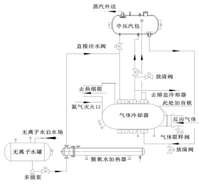 來自無離子水罐的脫氧水經(jīng)多經(jīng)泵加壓、經(jīng)脫氧水加熱器加熱后進入到主蒸汽流量計的水段,脫氧水與反應(yīng)氣體換熱后分兩路:一路進入中壓汽包,保證汽包有穩(wěn)定的液位;一路進入熔鹽冷卻器帶出熔鹽攜帶的反應(yīng)熱。來自中壓汽包的高溫水經(jīng)管路接至主蒸汽流量計汽段底部,高溫水與反應(yīng)氣體換熱后產(chǎn)生高壓蒸汽,高壓蒸汽又返回中壓汽包。汽包還有一路直接注水管路,此路水不經(jīng)過主蒸汽流量計水段,而是直接進入汽包。在主蒸汽流量計出口溫度偏低而汽包液位也比較低時,可開此直接注水管路來穩(wěn)定汽包液位。其詳細流程圖如圖 2。