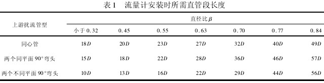 孔板流量計以簡單結(jié)實、成本低廉及無需額外標定等優(yōu)勢在工業(yè)中獲得廣泛應用。但它也有自身的缺點:受限于工作原理,量程比限制在3:1~5:1;在水錘作用下,孔板會變形,如果設計或安裝不當甚至會堵塞管道;孔板的直角邊緣在長期運行后會磨損,特別是在進行蒸汽介質(zhì)測量時會改變孔板特性,影響測量精度,因此必須對孔板進行周期檢查并予以更換;孔板流量計一般需要較長的直管段以保證精度,表1給出了不同直徑比β和不同上游擾流布置情況下所建議的直管段長度。