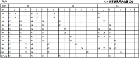 以上表值僅供參考,實(shí)際使用中因液體粘度和氣體密度不同應(yīng)在此值附近調(diào)整,頻率低時可將 K3 向大口徑方向調(diào)一至三檔。頻率高時可將 K2 向小口徑方向調(diào)一至三檔。