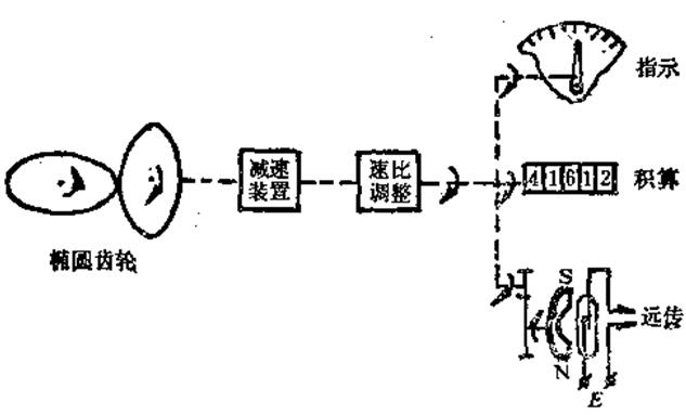 就地顯示將齒輪的轉(zhuǎn)動通過一系列的減速及調(diào)整轉(zhuǎn)速比機構(gòu)之后,直接與儀表面板上的指示針相連,并經(jīng)過機械式計數(shù)器進行總量的顯示。