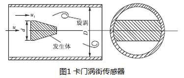 渦街流量計(jì)是根據(jù)“卡門渦街”原理研制成的流體振蕩式流量測(cè)量?jī)x表。在一定雷諾數(shù)范圍內(nèi)旋渦的分離頻率與旋渦發(fā)生體的幾何尺寸、管道的幾何尺寸有關(guān),旋渦的頻率正比于流量,其結(jié)構(gòu)原理如圖1所示。
