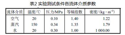 實(shí)驗(yàn)條件下空氣、蒸汽、水為測(cè)試流體介質(zhì)時(shí),各測(cè)試條件參數(shù)如表2所示。