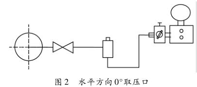 從圖中不難理解,冷凝罐中多余的冷凝水沿著斜坡流回母管,但是在實(shí)際現(xiàn)場中經(jīng)常選用的一次閥是針型閥,如果選用公稱通經(jīng)太小的話,使凝結(jié)水回流不暢而積在針型閥上方的引壓管內(nèi),引起引壓管密度不一致。測量蒸汽時(shí)母管與冷凝罐進(jìn)行汽液交換包括兩部分,一是母管內(nèi)的蒸汽經(jīng)一次閥進(jìn)入冷凝罐,二是冷凝罐內(nèi)的液體返回母管。在汽液交換時(shí)如果正負(fù)壓管是完全同步,交換的方向也完全一致,孔板取壓口的差壓轉(zhuǎn)換成凝結(jié)水的差壓,并不會(huì)產(chǎn)生差壓值的變化,但是實(shí)際上很難保證這種交換既同步又同向。這樣在蒸汽量小的時(shí)候,2個(gè)引壓管的密度之差乘以sin45°就會(huì)有一差值,這個(gè)差值通過一系列的計(jì)算會(huì)傳遞到變送器的差壓值,就會(huì)存在不計(jì)或者計(jì)量偏大的現(xiàn)象。如何解決上述問題,建議按照圖2安裝,水平方向取壓,盡管2個(gè)引壓管的密度還是有差異,由于θ=0°即sin0°=0,就不會(huì)存在差異值。但是還會(huì)存在示值波動(dòng),要解決示值波動(dòng)的問題,建議將針型閥換成閘閥或者球閥,要求內(nèi)徑不小于10mm,一次閥門的公稱通經(jīng)也要不小于10mm。