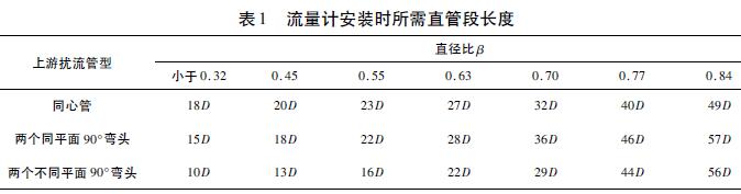差壓式流量計(jì)中常用的有孔板流量計(jì)和新型V錐流量計(jì)兩種型式??装辶髁坑?jì)以簡(jiǎn)單結(jié)實(shí)、成本低廉及無(wú)需額外標(biāo)定等優(yōu)勢(shì)在工業(yè)中獲得廣泛應(yīng)用。但它也有自身的缺點(diǎn):受限于工作原理,量程比限制在3:1~5:1;在水錘作用下,孔板會(huì)變形,如果設(shè)計(jì)或安裝不當(dāng)甚至?xí)氯艿溃豢装宓闹苯沁吘壴陂L(zhǎng)期運(yùn)行后會(huì)磨損,特別是在進(jìn)行蒸汽介質(zhì)測(cè)量時(shí)會(huì)改變孔板特性,影響測(cè)量精度,因此必須對(duì)孔板進(jìn)行周期檢查并予以更換;孔板流量計(jì)一般需要較長(zhǎng)的直管段以保證精度,表1給出了不同直徑比β和不同上游擾流布置情況下所建議的直管段長(zhǎng)度。