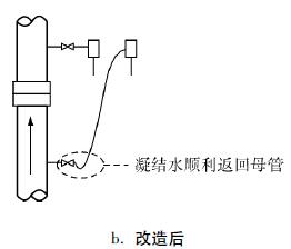 用差壓流量計(jì)測(cè)量蒸汽流量,為保護(hù)差壓變送器的高低壓室,通常設(shè)置兩個(gè)冷凝罐,兩個(gè)冷凝罐內(nèi)液位高度相等是壓差信號(hào)不失真?zhèn)鬟f的關(guān)鍵。如果發(fā)現(xiàn)一個(gè)冷凝罐是冷的,罐的上部必定不是蒸汽,造成這種情況的原因有多種,如:導(dǎo)壓管堵、根部閥堵、溢流口高度比取壓口低、在取壓口和冷凝罐之間存在液封等。不管是哪種原因,都將使差壓變送器接收到的壓差與節(jié)流件送出的壓差信號(hào)不相等,進(jìn)而引起流量測(cè)量誤差。如圖1所示,改造前到正壓冷凝罐的引壓管由于安裝坡度不合理形成U形水封,這段管內(nèi)的冷凝水不能靠重力流回母管,從而造成流量示值偏低。配置和安裝合理的壓差裝置后,蒸汽從母管經(jīng)導(dǎo)壓管流入冷凝罐,放出熱量后變成凝結(jié)水,罐中液位高于溢流口后自動(dòng)返回母管,從而保證兩個(gè)罐中的凝結(jié)水液位相等。