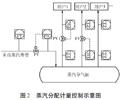 渦街流量計(jì)經(jīng)常與調(diào)節(jié)閥安裝在同一根管道上以控制流量或壓力。如圖2所示,來(lái)自鍋爐的蒸汽總管經(jīng)壓力控制回路調(diào)節(jié)后進(jìn)入蒸汽分氣缸并根據(jù)用戶負(fù)荷測(cè)量總蒸汽用量,分氣缸分配到各用汽設(shè)備或裝置,同樣安裝有壓力或流量調(diào)節(jié)控制回路。